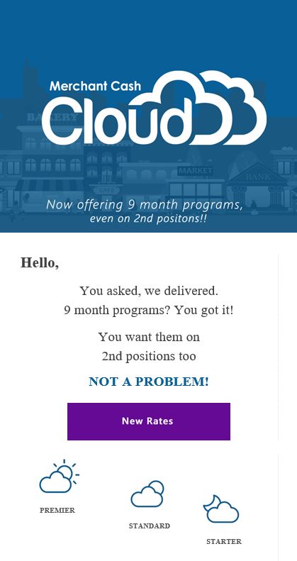 Starting Today, we are now offering 9 month programs.. WAIT FOR IT... EVEN on 2nd Positions! We are also offering bonus commission if you fund $150,000 for the month of February! Call us today at 1-800-515-7531 ext. 302 / 408 or email us at underwriting@merchant-cashcloud.com